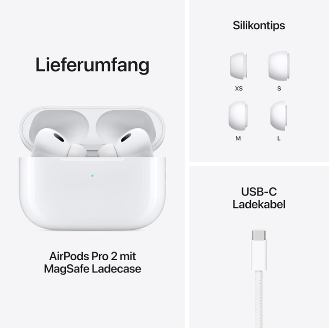Erlebe immersiven Sound mit aktiver Geräuschunterdrückung auf Pro Level Fußnote Adaptives Audio für eine ausgewogene Geräuschsteuerung in jeder Umgebung, Transparenzmodus, mit dem du dein Umfeld hören kannst Fußnote und die Konversationserknung, um die Lautstärke deiner Medien nahtlos zu reduzieren, wenn du mit jemanden in der Nähe sprichst. Fußnote Sowohl die AirPods Pro 2 als auch das kabellose MagSafe Ladecase (USB-C) sind nach IP54 vor Staub, Schweiß und Wasser geschützt Fußnote und du kannst sie mit der „Wo ist?“ App orten.